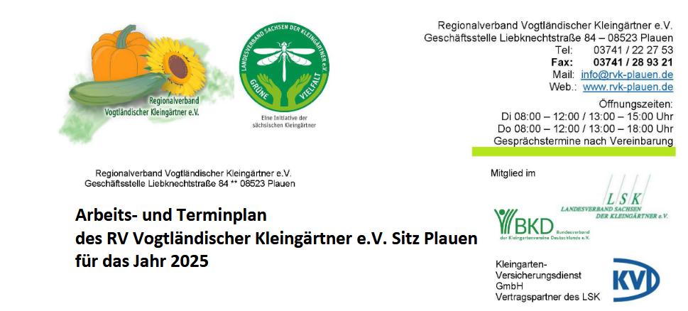 Ein Klick auf das entsprechende Bild öffnet Ihnen den Arbeits- und Terminplan des Regionalverbandes Vogtländischer Kleingärtner e.V. bzw. den des Landesverbandes Sachsen der Kleingärtner e.V..