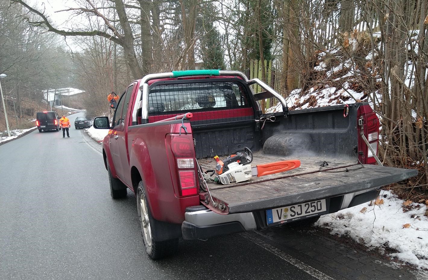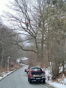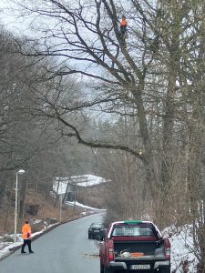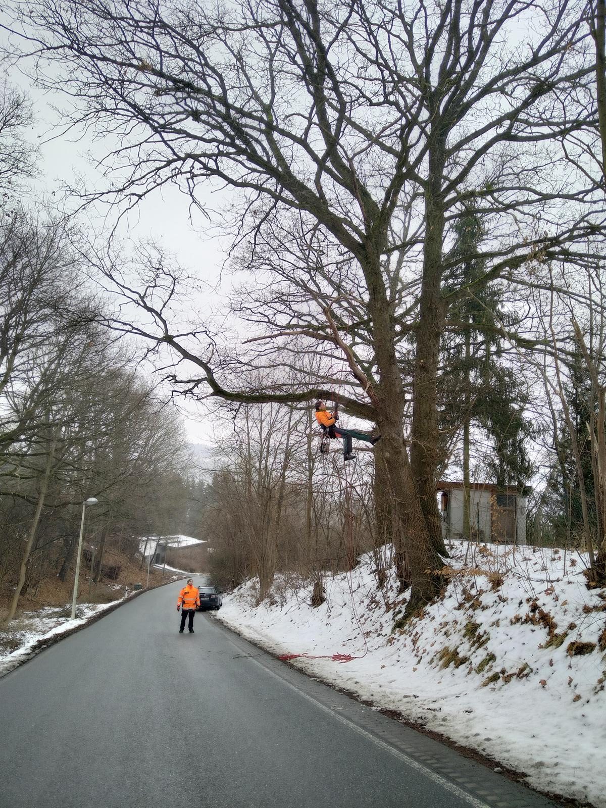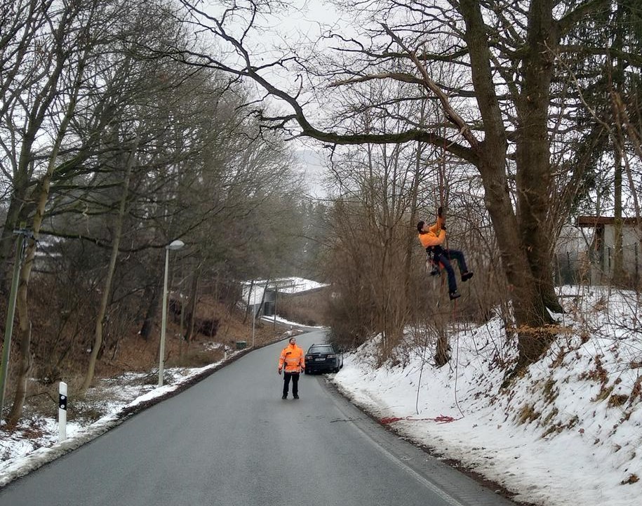 Auch das können wir: Straßensicherung für die Baumpflege, hier die Entnahme von Totholz aus dem Baumbestand durch einen professionellen Kletterer aus Triebel. Damit konnte enorm viel Geld gespart werden und eine teure Straßensperrung vermieden werden.